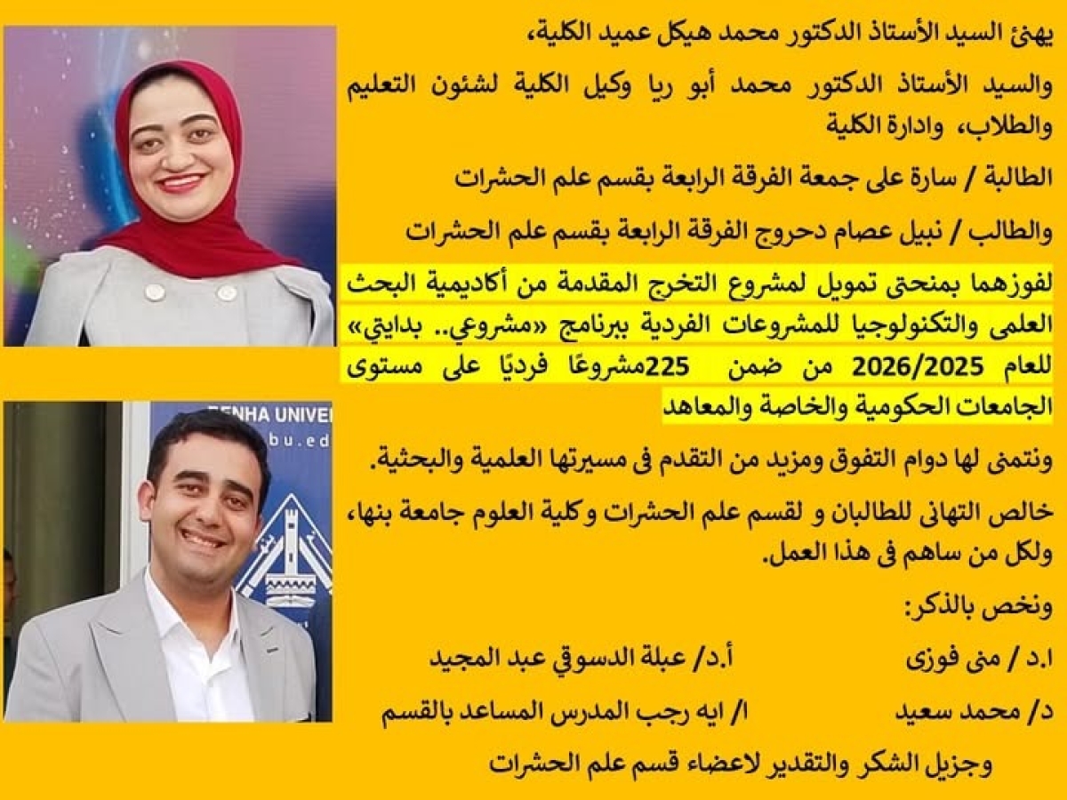 خالص التهاني للطالبان ولقسم علم الحشرات وكلية العلوم جامعة بنها،